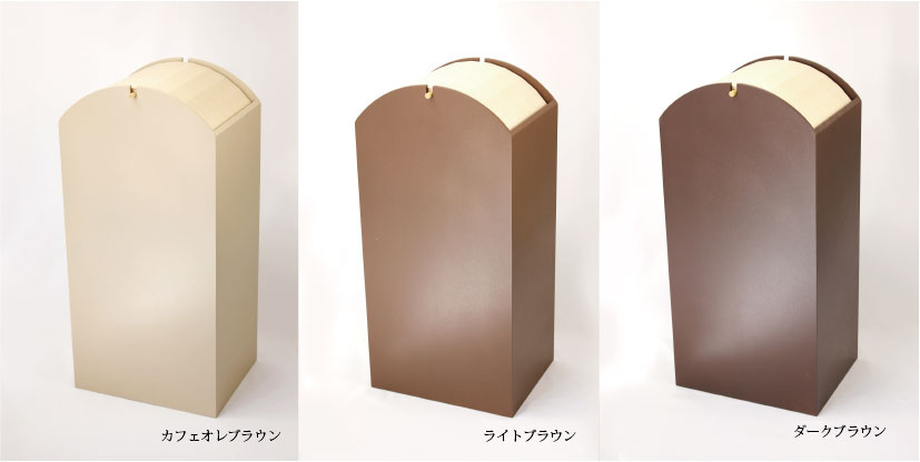 アーチ型の蓋がやさしい感じの雰囲気に。カラーはブラウン系にしぼって3色展開しました。