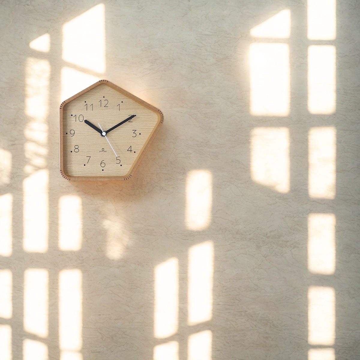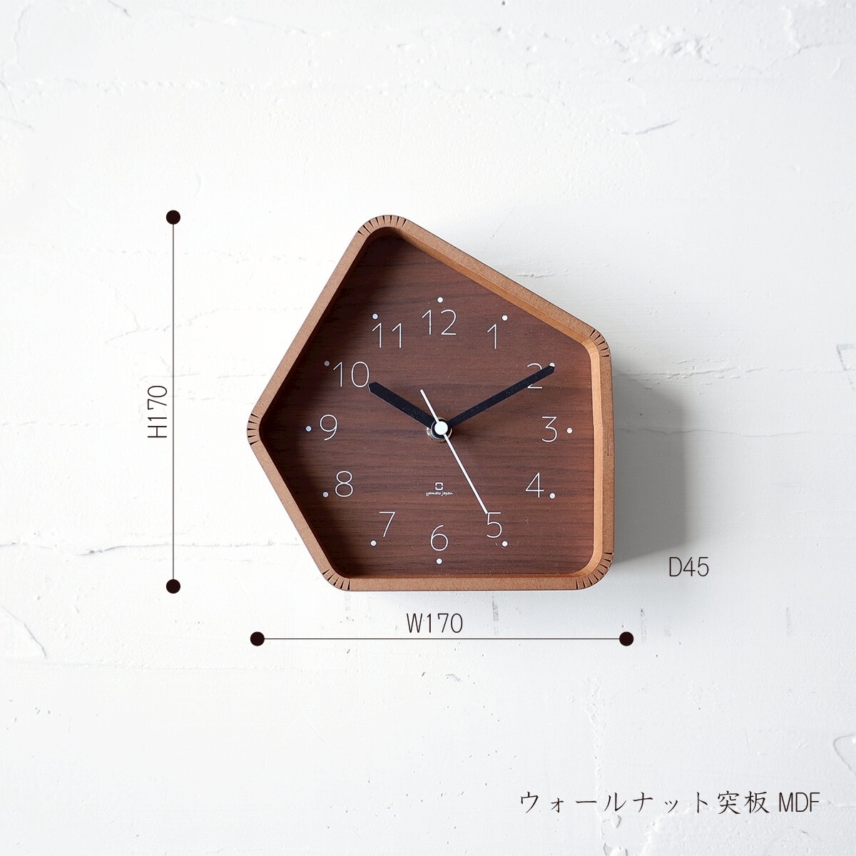 五角形のフォルムが、空間に遊び心を添えてくれる木製時計。